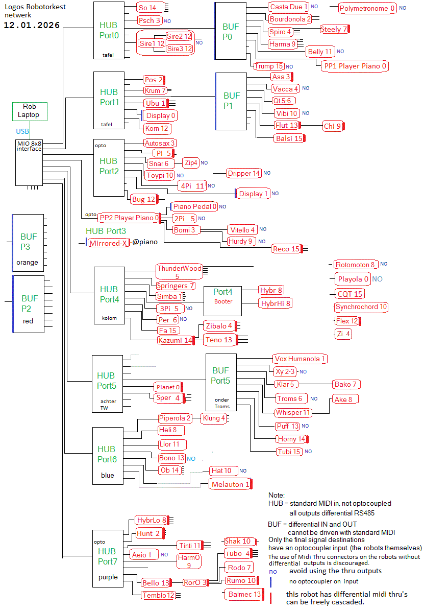 Port and Channel assignments as used in the Logos Robot orchestra [update 05.06.2024, using an 8/12 port midi device]:
