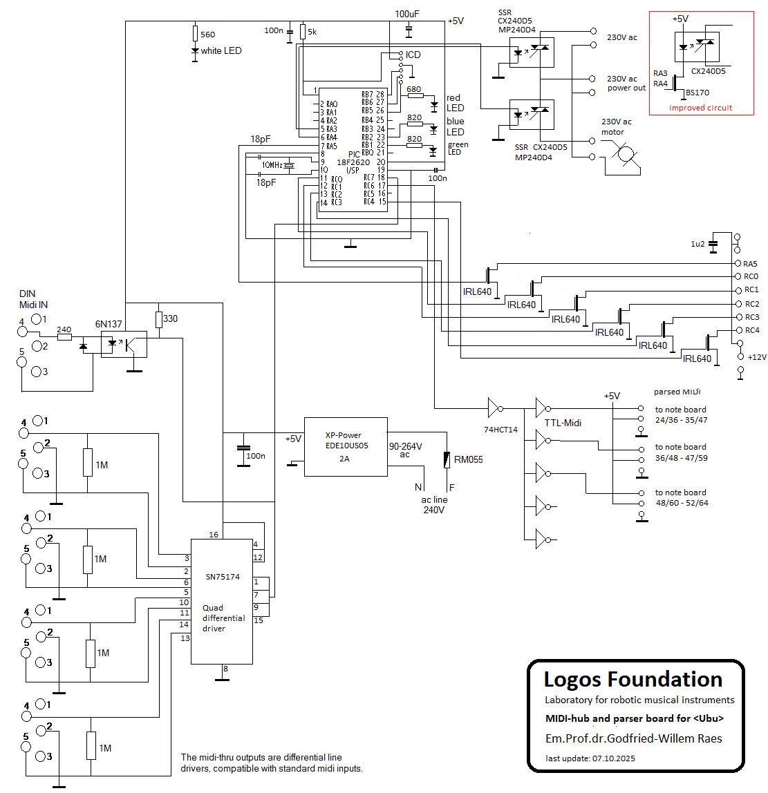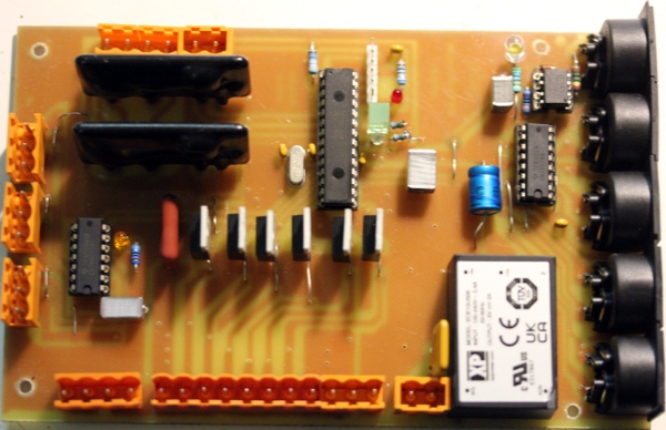 | Midi-hub board (parser, 18F2620 processor, with 2 optorelays) |