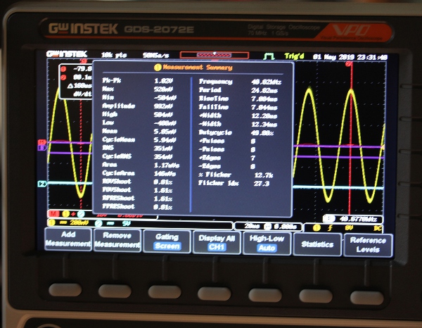 Another difference with the design above, is that here the first op-amp (OP27) is non-inverting and is configured for a fixed gain of 26dB, the second inverts, thus reducing the risk of feedback from vibrations of the VU meter and from electromagnetic coupling from the single sided PCB. The very expensive OPA627, a Burr-Brown precision chip, was used as its gain bandwidth product reaches 16MHz. Also here we drive the true RMS convertor (AD736) on its inverting input (pin 1), thus by far extending both bandwidth and dynamic range. Here is a PCB design: The 200% BMP drawing can be downloaded here. Here is a picture of two SPL meters, under construction: Here is a screenshot taken from our oscilloscope, during measurement and callibration of the meter: The bandwidth of the meter in this version is 20kHz to 100kHz within 3dB. The sensitivity is much better than in the first design. The BNC connector serves to connect an oscilloscope, handy for monitoring the waveform as well as checking for clipping if SPL level are very high. The MEMS microphone used can handle pressure levels up to 124 dB. The RMS value of the signal at the BNC connector would then be 4.48 V. (12.6Vpp, for a sine wave). Higher levels can damage the microphone. The measurement ranges are given in the following table: