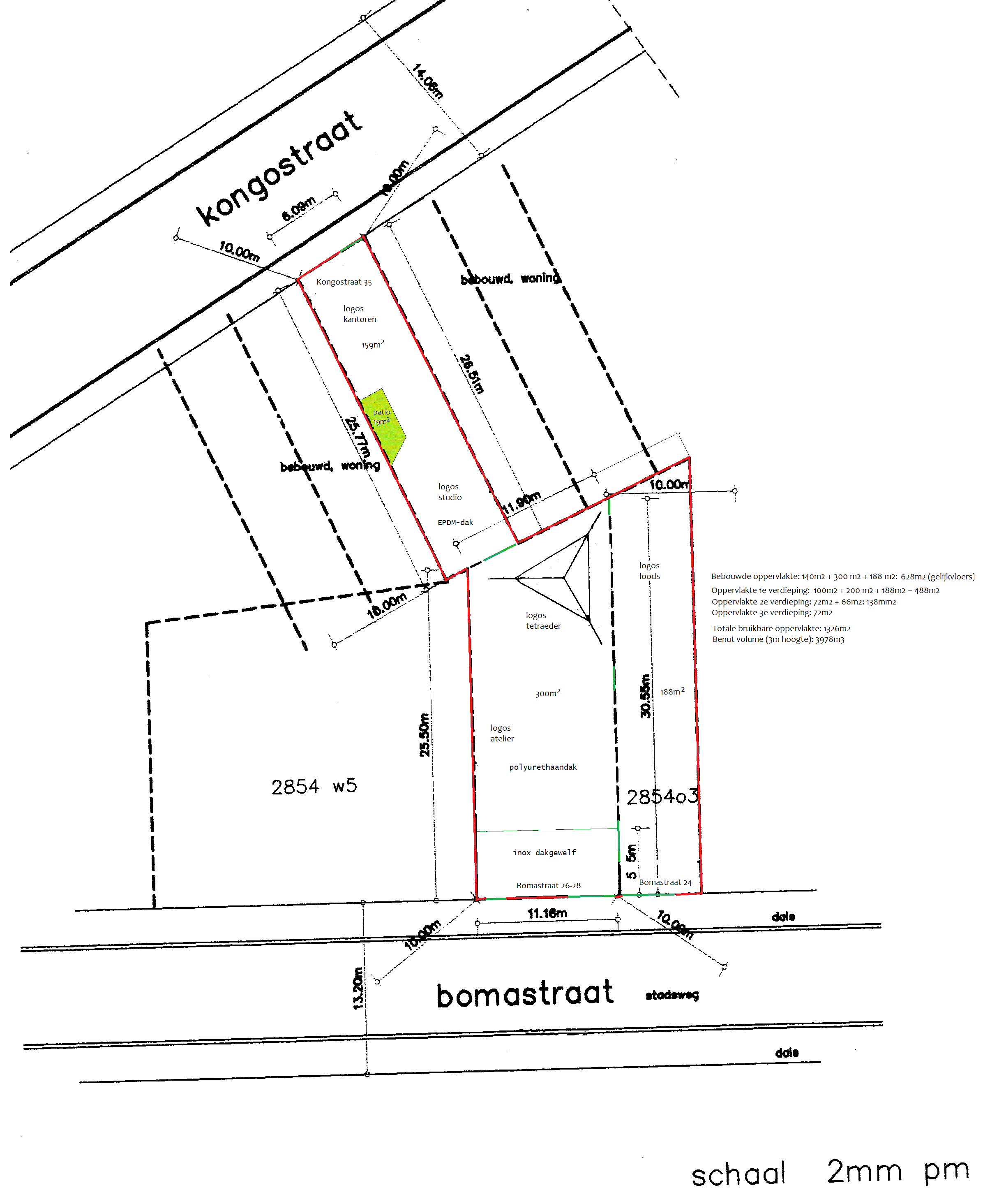 Oppervlakte van het in PU-uitgevoerde dak, Bomastraat 26-28: 450 m2. Vlakke grondvlakprojektie van dit dakgedeelte: 242.53 m2.