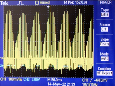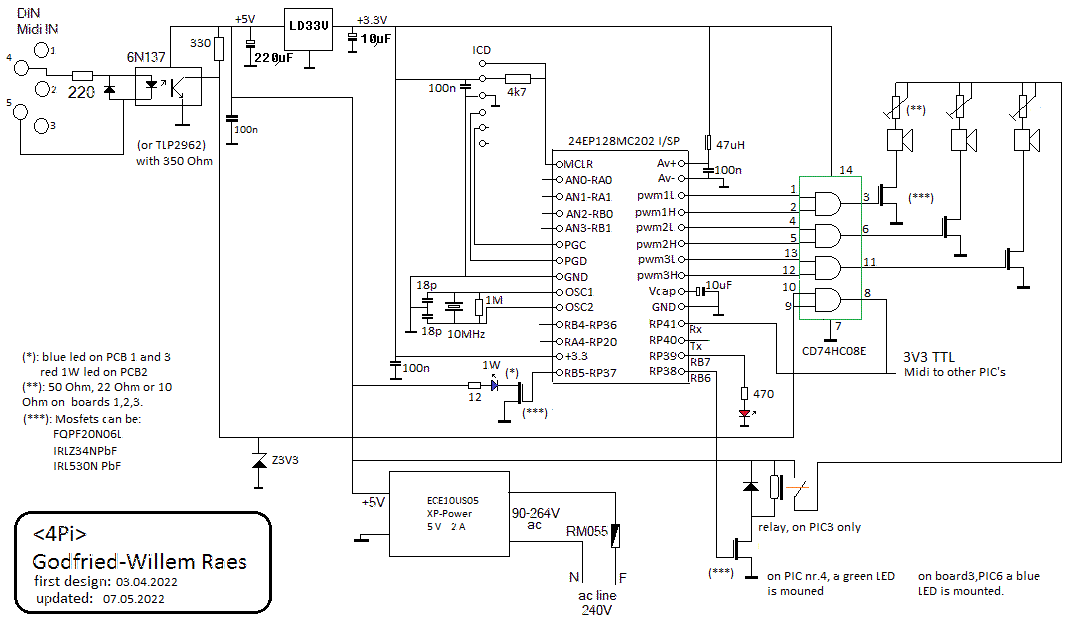 For driving and tuning the buzzers we designed a circuit build around the microchip Pic 24EP128MC202 microprocessor, in fact a chip developed as a dedicated 3-phase motor controller. The circuits are in principle identical to the ones used for <Pi> and <3Pi>, but the PCB boards were redesigned and improved on some details. Here we have three PCB's, each serving 18 notes. All sound synthesis is handled in the digital domain using PWM techniques. On each processor chip, three 16-bit timers are used to generate the required pitches with variable duty cycles. The three PWM channels working at a base frequency of >300kHz are used for the envelope control of each individual note by multiplying their output with the variable duty cycle square wave signal from the tone generators. No low pass filtering was applied, as all possible artifacts are situated well above the normal auditory perception range. Moreover, the coils driving the membranes serve as an intrinsic low pass filter due to their inductance (903 uH). We considered using analog control for the global volume control of the instrument as the power supply voltage for the buzzers controls directly the sound volume leading to a possibly better resolution in dynamics. However, after some experiments we dropped the idea mainly because it would introduce a high risk of overloading the buzzers if the instrument were given in the hands of not knowledgeable musicians. The current through the buzzers should be limited to 75 mA. Instead, we implemented a global level controller (#7) in the firmware using PWM at 300 kHz. The dynamic range is limited to 9 bits, or ca. 54 dB.