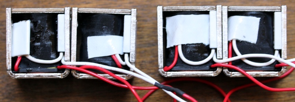 3.- gebruik van vier trekmagneten. Hier kunnen we volstaan met 6.5 Watt / 100% duty cycle types, die we met een verdubbelde spanning in pulsbedrijf kunnen aanwenden. Het vermogen (en dus ook de geleverde kracht) wordt dan opgedreven tot de viervoudige waarde, 24 Watt dus, bij duty cycle 25%. Dit kan, omdat eens de dokkenlijst verschoven is, de magneten verder onbekrachtigd kunnen blijven. Ook in dit geval zijn we verplicht aan elke zijde van het instrument twee dergelijke magneten te plaatsen. De uitsteeksels aan de zijkanten van het instrument die dit voor gevolg heeft kunnen echter worden beperkt tot 50 mm.