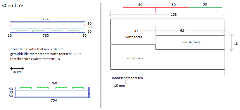 De bouw leverde wel wat moeilijkheden van ontwerptechnische aard op. Aanvankelijk hadden we alle spiraalvormige terugkeerveertjes op de elektromagneten helemaal verwijderd. Uit proeven was namelijk gebleken dat dit de repetitiesnelheid zeer ten goede kwam. Maar... omdat het nochtans erg kleine gewicht van de ankers zo permanent op de toetsen kwam te liggen, kwam de demping van heel wat snaren bij het loslaten van de toets in het gedrang. De voor die demping nodige kracht bleek tot overmaat van ramp, heel erg verschillend te zijn van toets tot toets en volkomen afhankelijk van de afregeling van de dokjes. Dit noopte ons ertoe alle veertjes opnieuw aan te brengen. Het daardoor geintroduceerde probleem was nu, dat het hele mechanisme erg luidruchtig werd omdat bij het lossen van de toetsen, de ankers vrij konden 'dansen' op het aanraakvlak van de toetsen. Om dat rammelende euvel op te lossen konstrueerden we een dubbele met dik vilt beklede demperlat, waarmee de veerresonanties grotendeels konden worden gesmoord. Een volgend probleem waarmee we te maken kregen was de ongelijkheid van de nodige aanslagsterkte voor de zwarte versus de witte toetsen. De verschillende lengte van de hefbomen, die de toetsen uiteindelijk toch zijn, maakt dat er een krachtverschil is van enkele procenten. Dit losten we op door kompenserende velocities uit te sturen voor de kromatische en de diatonische tonen. Een verder inherent probleem was dat de aanslagkracht ook een funktie is van de snaarlengte. Voor de lage -en dus lange- snaren is alweer iets meer kracht nodig. Tenslotte kregen we ook nog af te rekenen met het -op zich simpel in te zien- verschil in aanslagsterkte in funktie van de registers. Immers wanneer een toets twee snaren moet tokkelen, is een dubbel zo grote kracht nodig dan bij een enkele snaar. Om die trouwens worden klavecimbels vaak zo afgeregeld dat wanneer twee registers aktief zijn, de plektra op een iets anders moment de respektievelijke snaren aantokkelen. Dit wordt ook heel goed beschreven in het boek van Hans Neupert, vermeld in de bibliografie onderaan deze webpagina. Dat is bovendien ook goed hoorbaar wanneer een toets heel traag wordt ingedrukt. Uiteindelijk slaagden we erin al deze parameters in de firmware in te bouwen waardoor die met recht en reden 'smart' kan worden genoemd. Een laatste, maar eigenlijk voor ons zo goed als onoplosbaar probleem heeft te maken met onderlinge verschillen in kracht naargelang de lengte van de plektra in de dokjes. Onoplosbaar, omdat dit geheel afhangt van de nauwkeurigheid waarmee de speler of instrumentenbouwer die plektra snijdt. Voor wie het allemaal wil narekenen, hier een gedetaileerde maatschets voor dit klavecimbel: