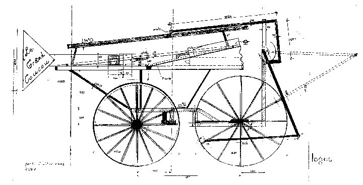 Het voorste wielenkoppel is afkomstig van een oude koets (16 spakige houten wielen van 117 centimeter diameter) , terwijl het achterste paar volkomen van eigen makelij is. Hiervoor verbeterden we het elegante een veerkrachtige 6 spakig ontwerp van de 'Carossa dell Impossibilita dell unisono' uit 1995 (twee van deze wielen sneuvelden in een vorige stoet onder het sadisme van de Gentse kasseien...) door het aantal spaken te verdubbelen tot 12 en de diameter te vergroten tot 126 centimeter. Via een excentrisch punt op een spaak van elk achterwiel -onderling een halve cirkel uiteengeplaatst- en een stangenmechanisme wordt dan een zware wals in beweging gebracht die de blaasbalg op een neer doet gaan. De achterwielen zijn dicht bijeen geplaatst en draaien om een gemeenschappelijke vaste as. Dit is het soort mechanisme dat ook in motoren wordt gebruikt voor de overbrenging van de zuigerbeweging op een roterende as. Wie het mechanisme aan het werk wil zien, kan steeds ons demo programma 'wielen.exe' via de voorziene link runnen, mits hij tenminste een PC heeft. Voor de opname van <Le Grand Coucou> in <Rooie Niki> in 1998, drongen enkele konstruktieve wijzigingen zich op. Zo werd de Coucou voorzien van een zadel, gemonteerd bovenop de gehele konstruktie. De berijder kan nu de dubbele balg met de voeten zelf bedienen. Het mechanisme op de achterwielen wordt nu gebruikt voor de (manuele) aandrijving door twee duwers. Tevens werd nu een stuurstang, bediend door een stuurman, voorzien. Tussen de voorwielen hangt nu het grote rode hart van de koekoek.
