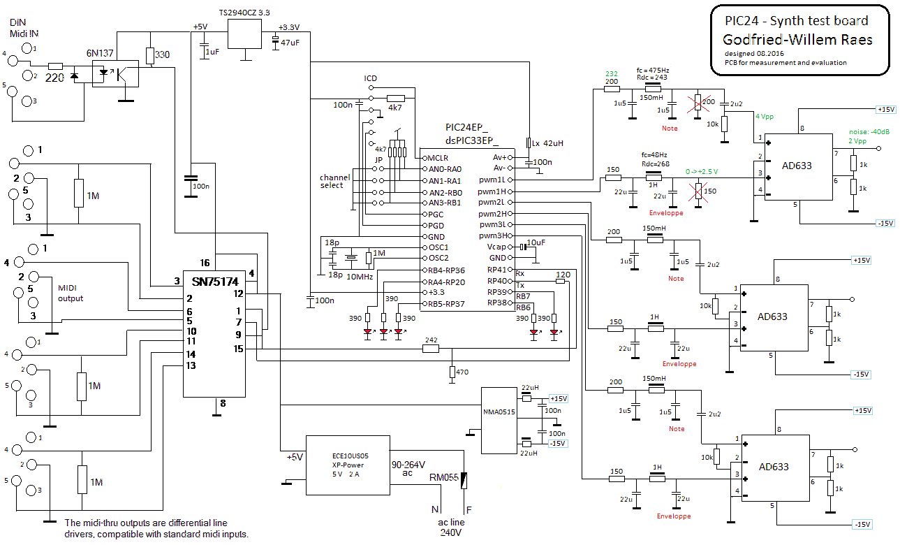The electronic circuitry consists of a midihub board containing a MIDI parser,