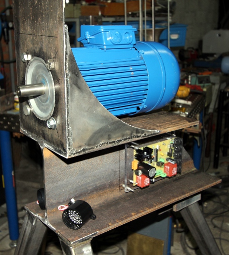 As we did not find enough space on the board to accomodate a 2.2mF / 450V electrolytic as originally foreseen in the schematic, we mounted a 470uF/400V type. If a larger value is required it will have to be added off-board. The motor brake relay as well as the braking resistor (or light bulb) should be mounted on the motor itself. As parts of the PCB are directly coupled to the mains voltage a word of warning may not be misplaced here: this board does carry high voltages! Do not touch. There is galvanic isolation between input and output, so using the circuit involves no danger. The steel structure itself is properly grounded.There are two automatic fuses on the machine making it possible to cut all power, however these fuses should not be used as a switch taking into account that being in such close proximity to the propeller entails a danger in its own, For safety reasons we advise users to use a switch in the power wire at least 5 meters away from the engine.