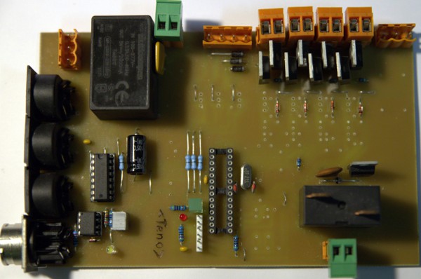 2. Sound generator board: This board steers the 75 Watt motor compressor horn driver via a digital audio amplifier module. A 16-bit processor is used to generate the required waveform and two analog multipliers are used for envelope shaping and amplitude modulation. Thus we could maintain audio resolution even at the lowest soundlevels. Handling this in the full digital domain would have required a fast 32-bit processor. The analog dynamic formant filter also found a place on this board.
