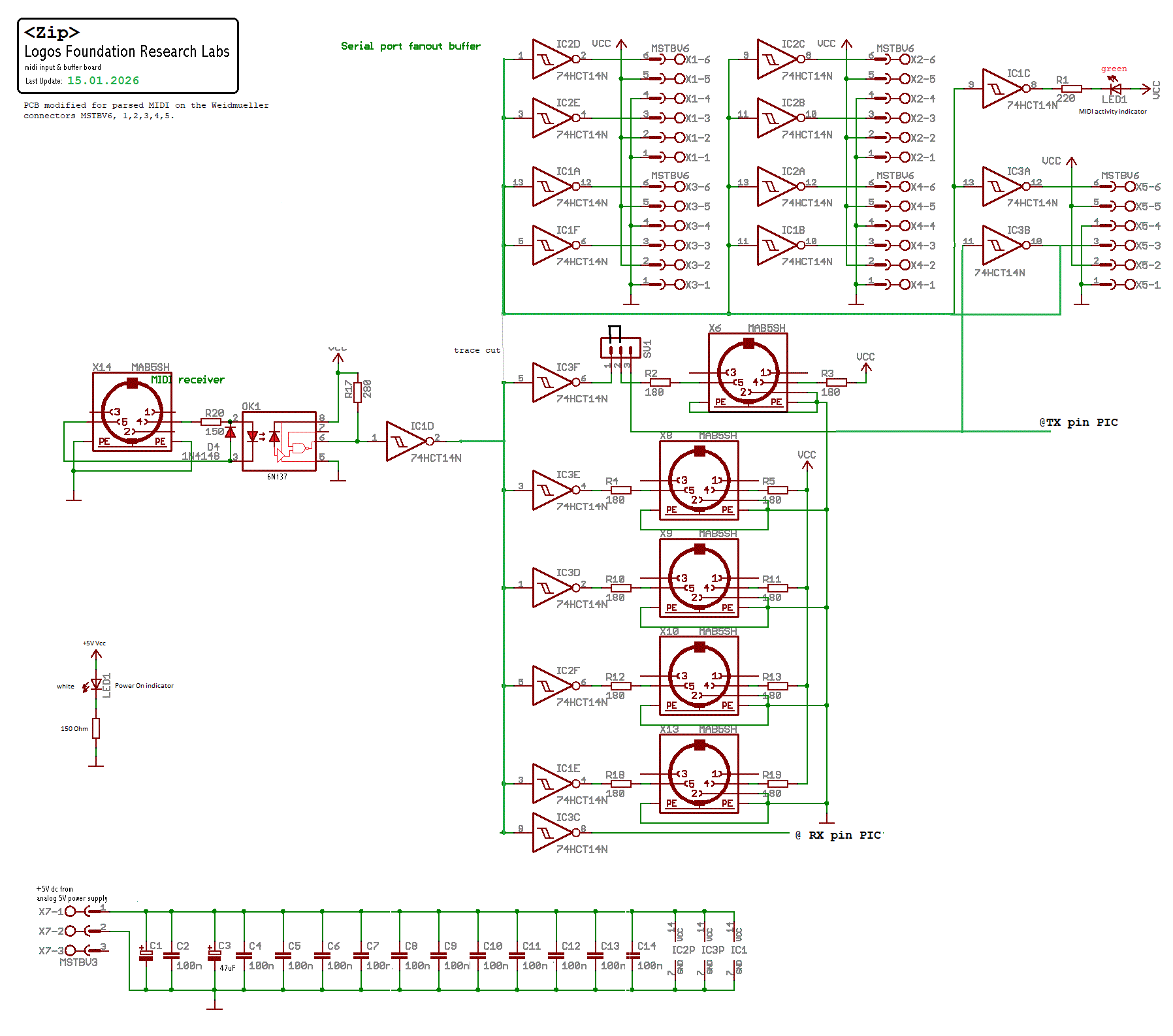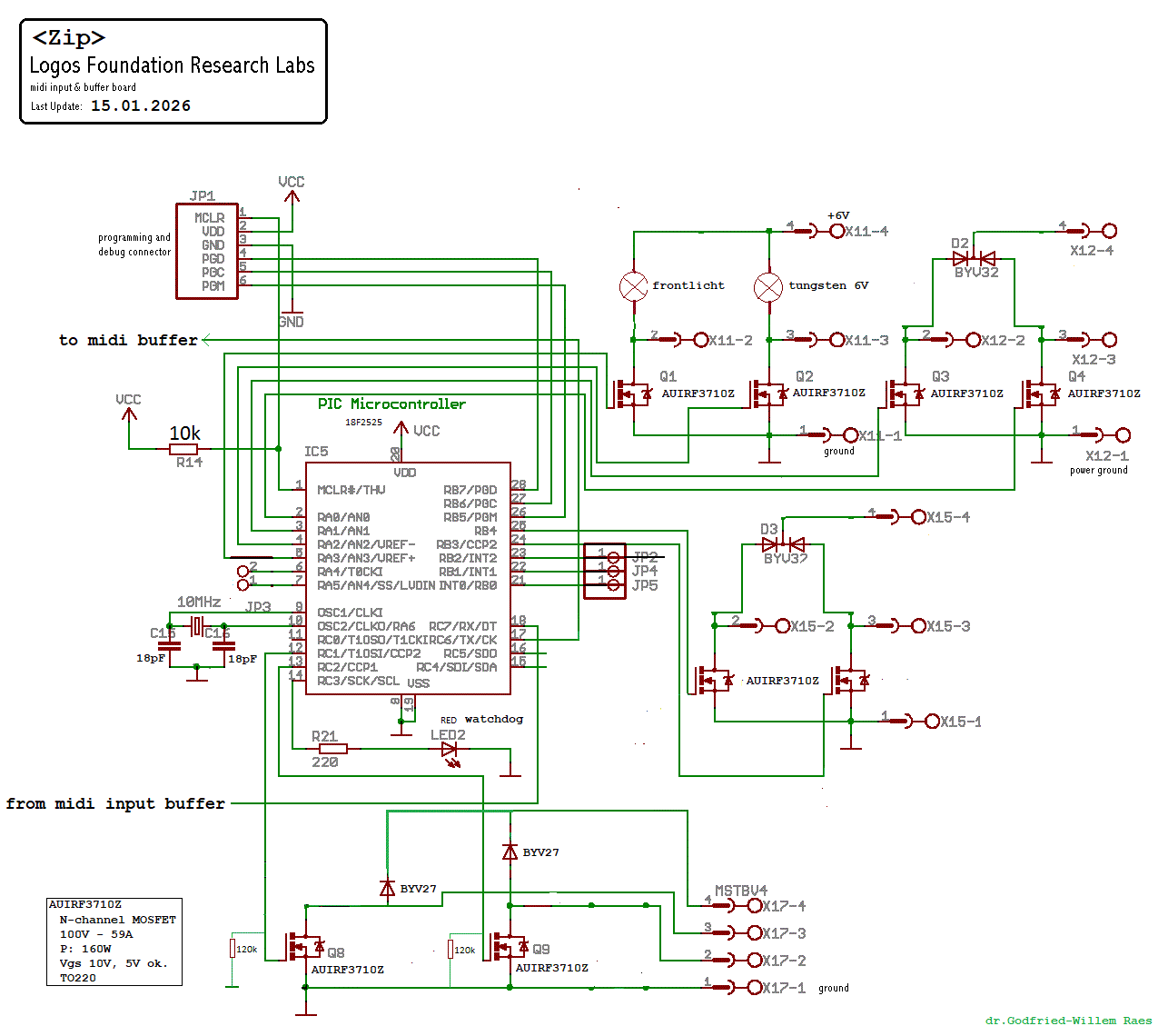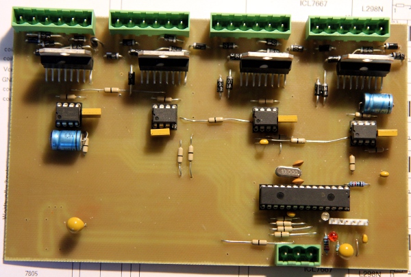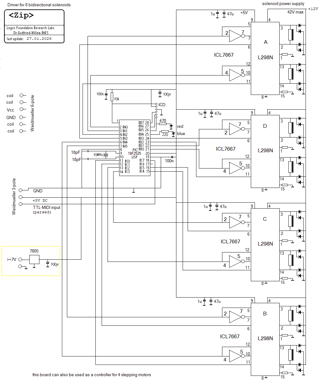 Not only the plucker assembly had to be completely build again and redesigned, but also the electronics, including the power supply. This type of solenoid requires pulses of alternating polarity, thus requiring H-bridges to drive them. We used an old and proven H-bridge in IC form, the L298N. With a single 18F2525 microprocessor chip, we can steer a group of 8 solenoids. Here is the circuit: