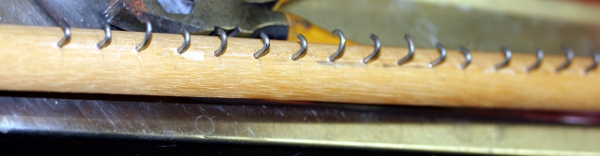 Five of these boards were required for the complete qanun. The power requirements turned out to be a lot more relaxed as compared to the first prototype design. This mainly because of the pulse-only operation of the solenoids. However, these solenoids having a DC resistance of only 4.2 Ohms, draw a pulse current of 2.8A each, which is at the limit of what the L298 drivers can cope with. The data sheet specifies a maximum of 3A, non repetitive pulse. The pulses being limited to maximum 50ms with a 50% duty cycle relaxes the limits though. Unfortunately there is as yet no integrated MOSFET H-bridge on the market with a wider range. As to the power supply, a 12V / 500VA transformer and some unortodoxically paralleled LT1024-12V regulators seemed adequate. Here is a picture of these small solenoids: