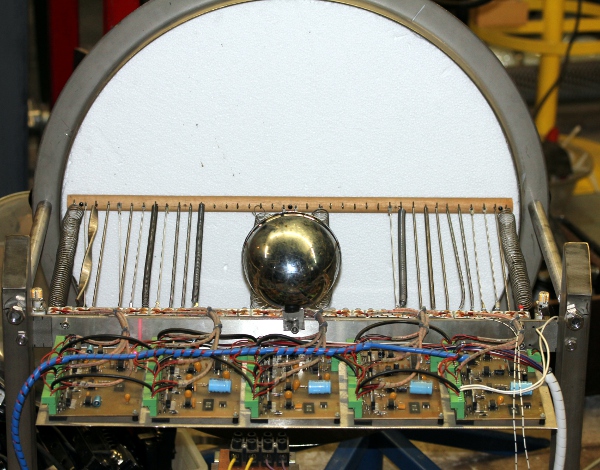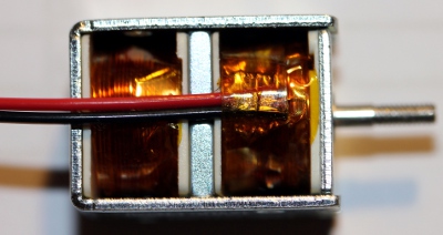 :These components are normally used as register knobs on pipe organs with electromagnetic registration. We contacted the factory in order to obtain these components with a straight anchor, as this would be much easier to attach the plectra. The picture shows the plucker mechanism with associated electronics before wiring. However, we never got this mechanism to work well as a string plucker. Later we found a good use for this mechanism in our <Tinti> robot.