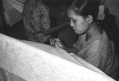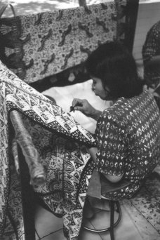 Het wordt een heel tof en vooral ook leerzaam bezoek. Vrouwen van alle leeftijden werken met een engelengeduld onverstoorbaar verder aan de meest ingewikkelde motieven. Het maakt hen niets uit of we op hun vingers staan kijken of niet. Met een koperen werktuigje, uitgerust met een fijne gietteut, wordt een uit bijenwaslijntjes opgebouwd motief getekend. Na ieder kleurbad komt er een nieuw lijnenweb bij. De werksters dragen een lederen schort, waar ze om te streep even hun was over afstrijken. Hun schorten zien eruit als schitterende hedendaagse kunstwerken. Mocht Joseph Beuys dat hebben gezien…