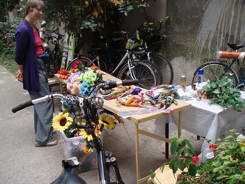 ![]() Tegen de tijd dat we ermee klaar zijn, zijn reeds een aantal deelnemers toegekomen. En wat blijkt: er komt eerst nog een voorafgaandelijke workshop “Pimp your Bike”. Allerhande bloemen, klimop, knuffeldiertjes en poppetjes worden op de fietsen gemonteerd. Het geheel krijgt een uitdagend vrolijke aanblik.