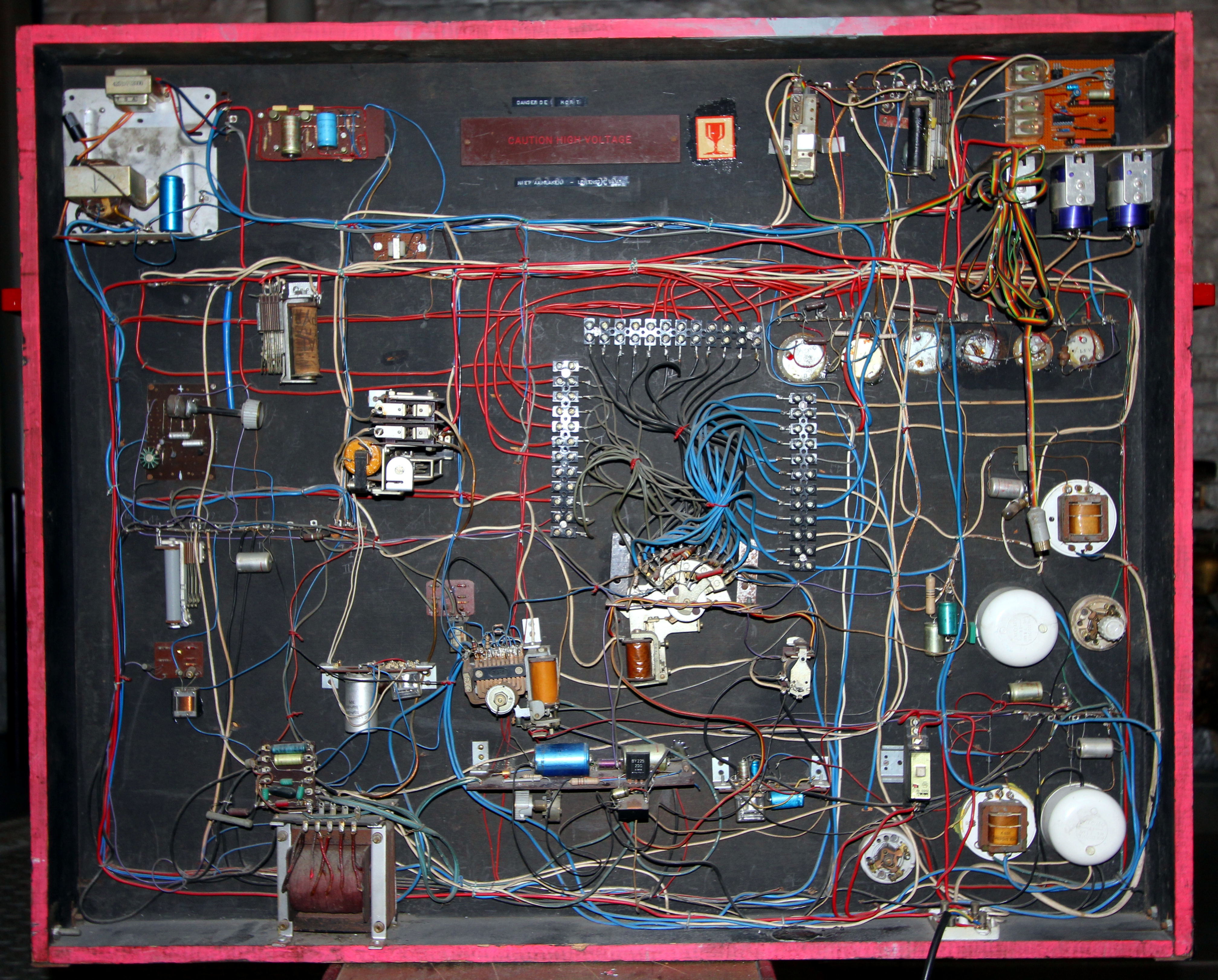 It took me more than two years to collect and to select the complete set of devices build-in into this machine. All acoustical signals which generally are used to make people move in connection to a physical or non-physical barrier were selected for this project. This can be most clearly explained by the example of the door-bell: on the one hand, the street, domain of publicity - and associated to it, all connotations of danger, agression, vulnerability, movement, perceptibility,... - on the other hand, the house, temple of privacy, with its connotations of safety, propriety, rest, love, tenderness, protection.