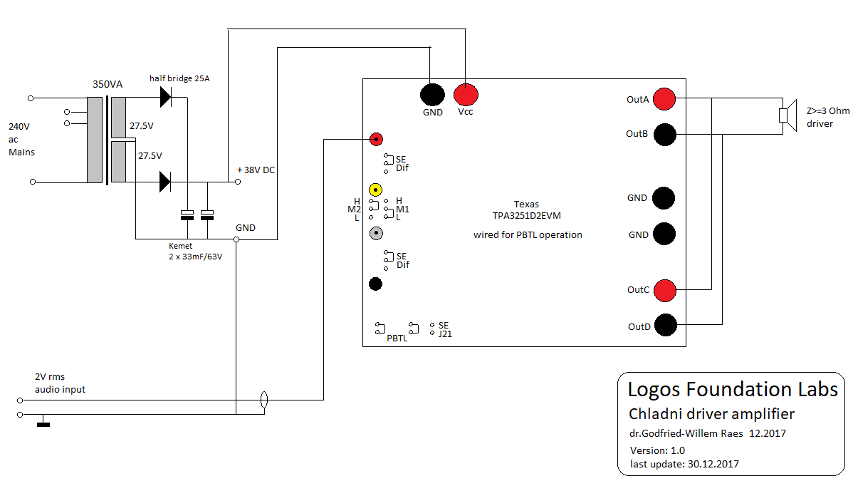 For driving the plate and the driver, a very powerfull amplifier is required, capable of delivering at least 250W into 4 Ohm. We designed a class D amplifier using a TPA3251D2EVM evaluation board from Texas instruments. The power supply for this amp is a classic analog and linear design. thus avoiding spurious signals that tend to result from the use of switched mode power supplies. Here is the complete circuit for the power stage: