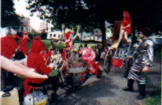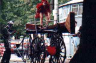 ... vanuit een andere straat komt de <Toetkuip> aangereden. Frontaal gestuurd door alweer een alter ego van Rooie Niki [Kristel Goorts] , bediend door nog een Rooie Niki [Valerie Bouckaert] en voortbewogen door twee sterke duwers. [David Baeck, Sarah Peters]. Toetkuip baant zich een weg en komt op een bepaald punt oog in oog te staan met de <Grand Coucou>. Het pad is duidelijk te smal. Er ontstaat een ondraaglijke spanning... Wie zal wijken om de ander doorgang te verlenen?